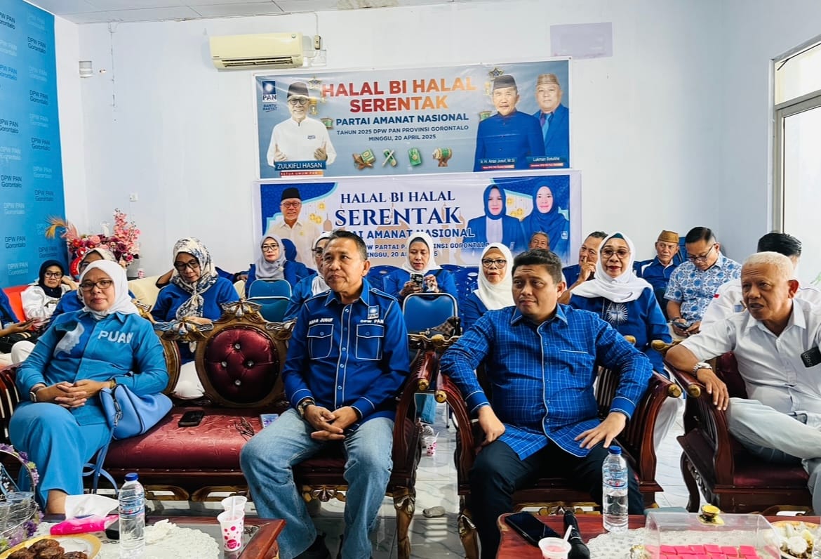 Gorontalo — Keluarga besar Partai Amanat Nasional (PAN) Provinsi Gorontalo turut berpartisipasi dalam kegiatan Halal Bi Halal nasional yang diselenggarakan dalam rangka Hari Raya Idulfitri 1446 Hijriah. Acara ini diikuti secara serentak oleh seluruh kader PAN di berbagai wilayah Indonesia, dan dihadiri langsung oleh Ketua Umum PAN, Zulkifli Hasan, secara daring.