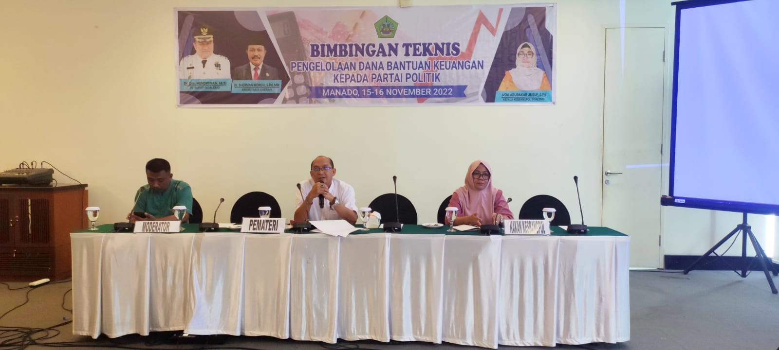 Boalemo -Kantor Kesatuan Bangsa dan Politik Kabupaten Boalemo menggelar Bimbingan Teknik Pengelolaan Dana Bantuan Keuangan Partai Politik bagi bendahara Parpol tingkat Kabupaten Boalemo. Manado, (15/11/2022).