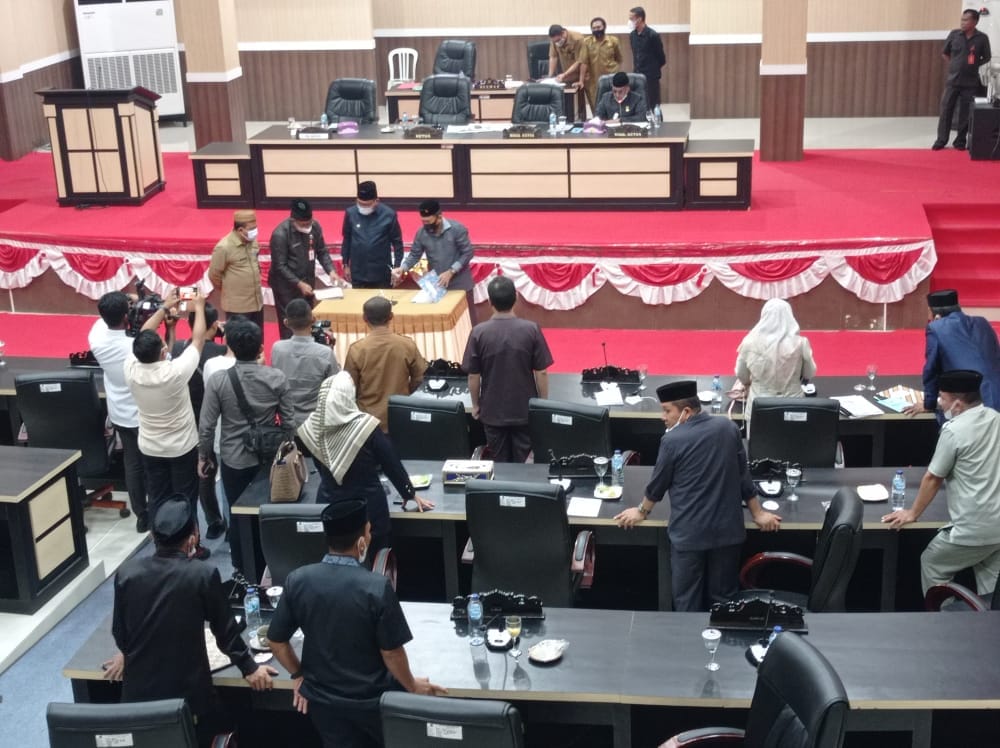 Boalemo – Berlangsung pada rapat paripurna yang digelar oleh DPRD Kabupaten Boalemo, Plt. Pemerintah Daerah menyerahkan dokumen Kebijakan Umum Anggaran serta Prioritas dan Plafon Anggaran Sementara (KUA-PPAS) APBD tahun anggaran 2022 kepada anggota legislatif. Selasa, (9/11/2021).