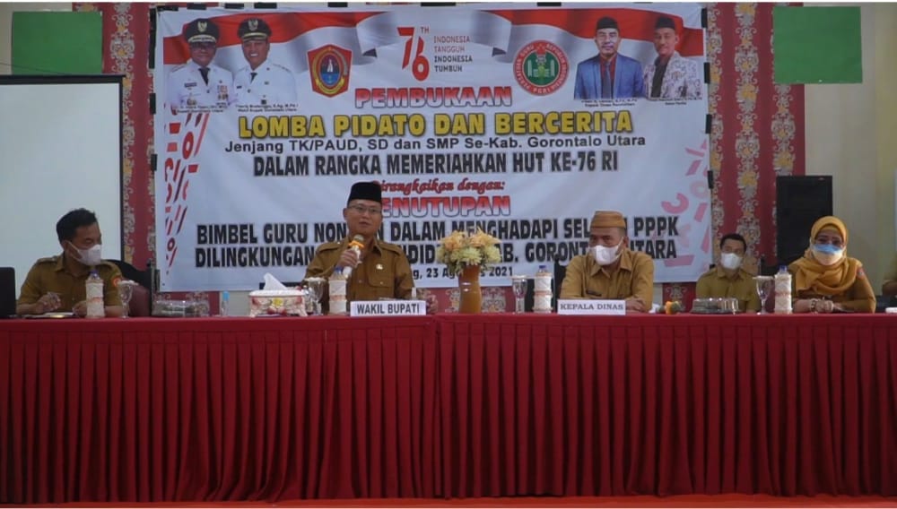 SHARENEWS.ID, Gorut- Wakil Bupati (Wabup) Kabupaten Gorontalo Utara (Gorut), Thariq Modanggu memberikan apresiasi kepada Dinas Pendidikan Gorut yang telah menyelenggarakan lomba pidato dan bercerita yang di ikuti oleh siswa TK, Paud, SD, dan SMP sebagai salah satu bentuk strategi dari pemerintah daerah untuk memanfaatkan tantangan dimasa Pandemi Covid-19.